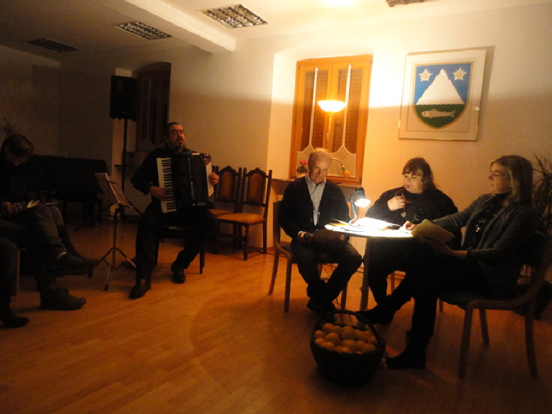 Ljubezen nas je pripeljala 11. novembra na Ladin večer, na glasbeno literarni recital ljubezenske poezije KD PoBeRe z gosti iz Tolmina, Benečije, Vidma in Trsta in glasbe harmonikarja Aleksandra Ipavca - Ipa, vedno bolj prisotnega tudi v Posočju. V intimnem vzdušju zamolkle, a tople svetlobe, so si za okroglo mizico, ob vznožju katere so se v košari ponujali oranžni sadeži iz sadovnjaka našega tržaškega gosta Marka Kravosa, v krožni liniji sledile male skupine literatov s svojo ljubezensko liriko, ki je ob izmenjavah počasi prehajala v nežno in temperamentno žlahtno glasbeno improvizacijo.